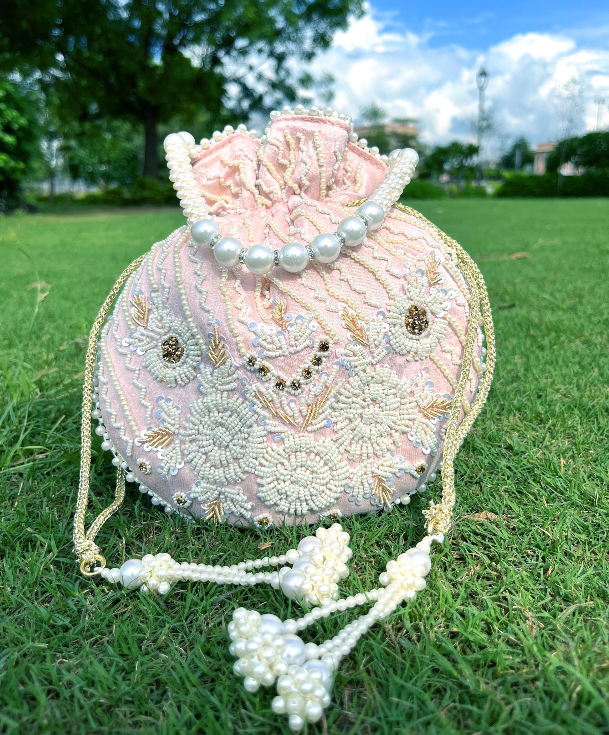 Blush Pink Bridal Potli Bag: Zardosi White Embroidered Pearl Handbag | Halloween Bag