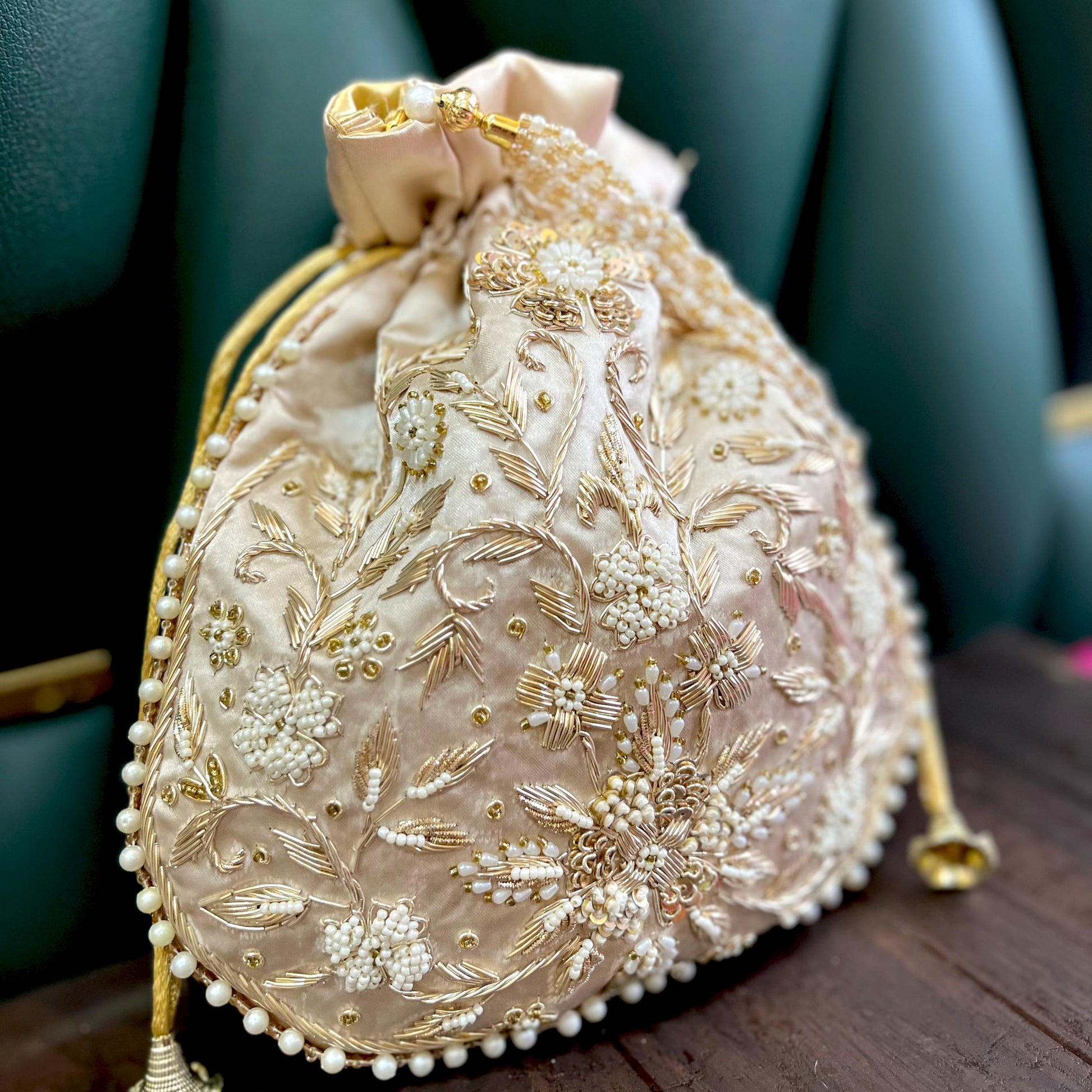 Champagne Gold Potli Bag: Pearl & Zardosi Embroidery, Bridal Purse