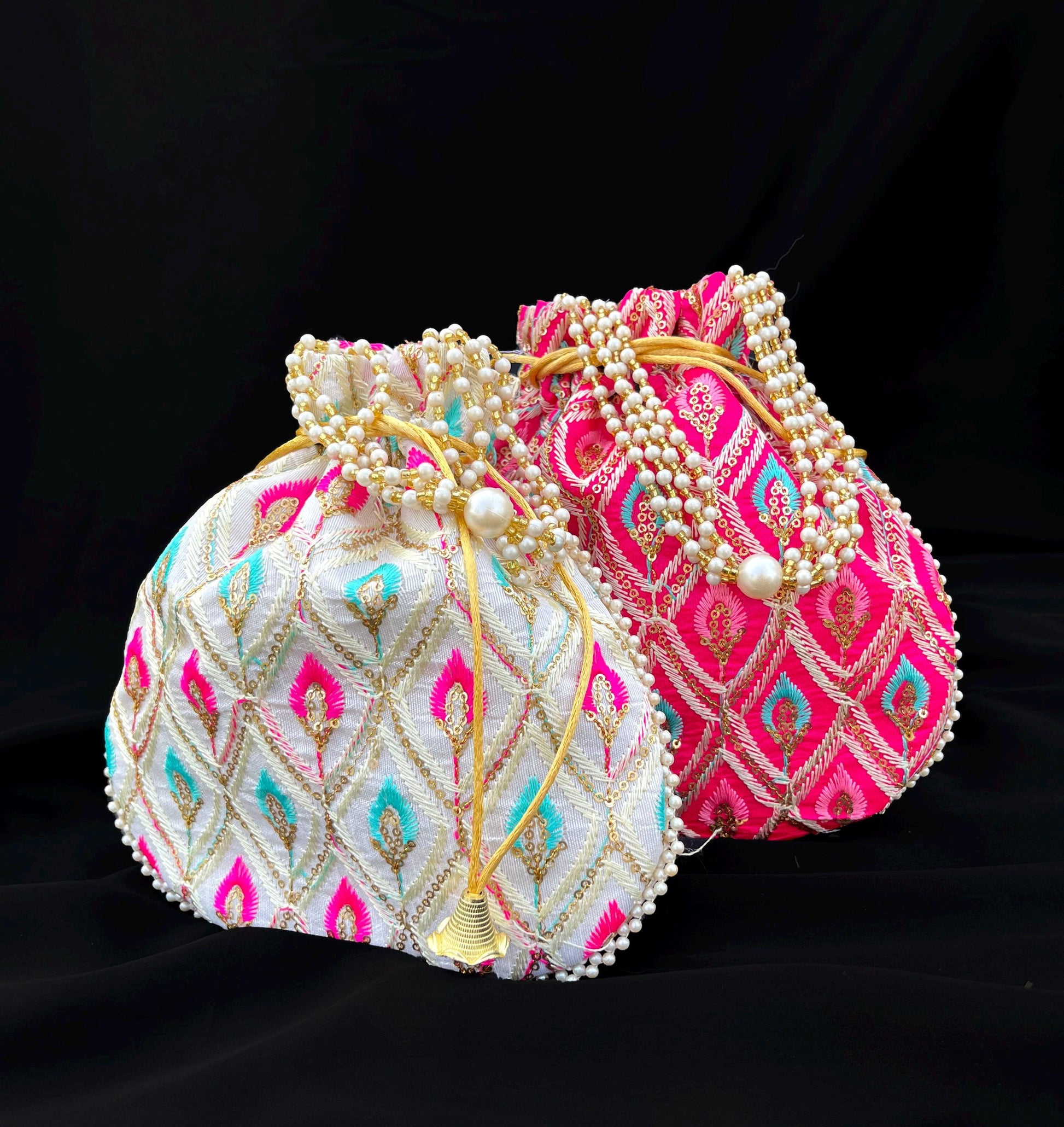 Exclusive Indian Style White and Pink Embroidered Potli Bags with Drawstring Pattern for Wedding Favors / Casual Wear / Parties / Evening
