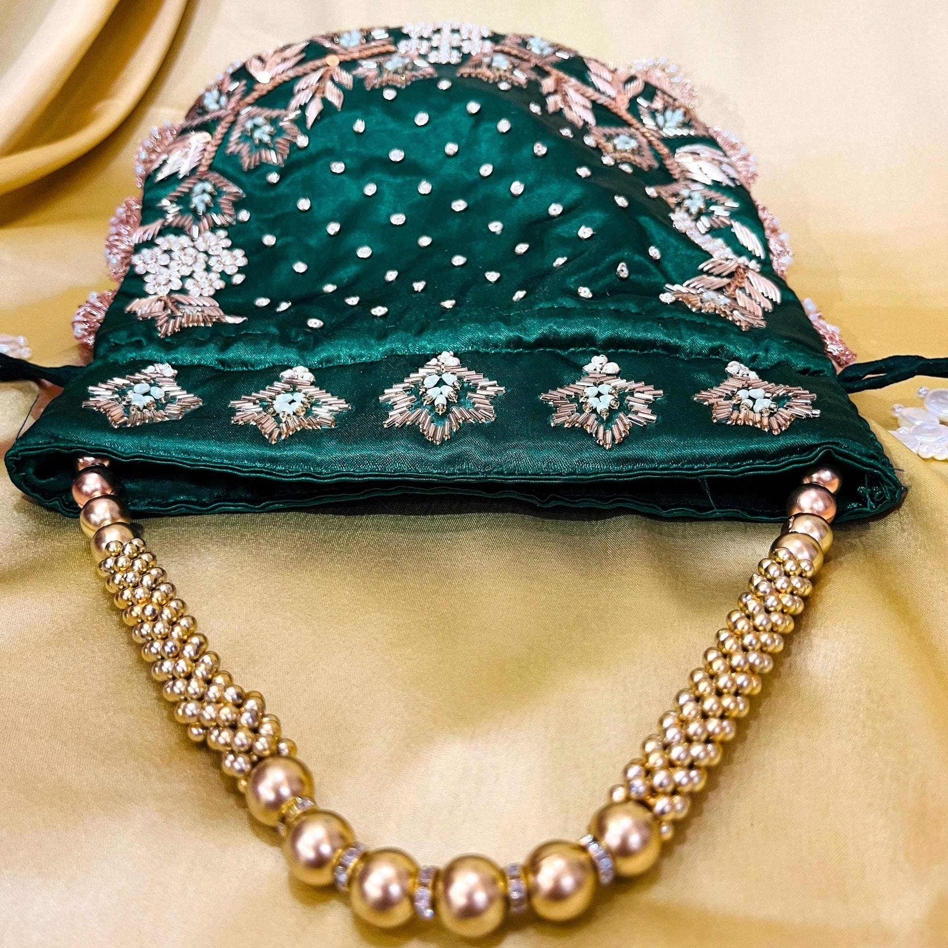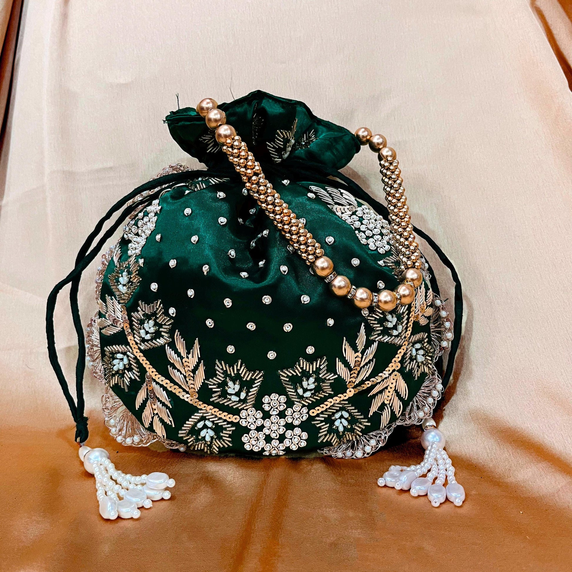 Elevate your ethnic style with this exquisite handmade emerald green embroidered / Zardosi Work potli bag, crafted to perfection for special occasions. Made from rich satin fabric, this elegant drawstring pouch is adorned with intricate golden thread embroidery, shimmering sequins, and delicate pearl embellishments. The beaded pearl handle adds a regal touch, making it perfect for brides, bridesmaids, and festive celebrations.