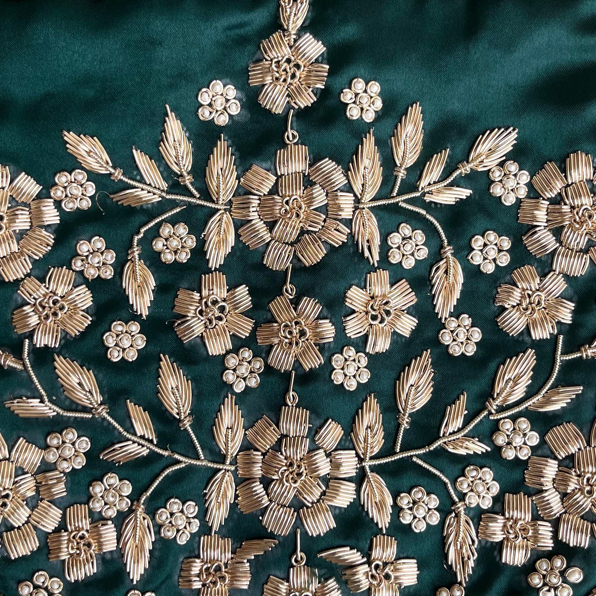 Make your outfit stand out with this beautifully handcrafted emerald green potli bag, designed with detailed golden embroidery and a pearl-beaded handle. Inspired by traditional Indian artistry, this bag blends timeless elegance with modern flair — perfect for weddings, cultural events, or as a unique gift.