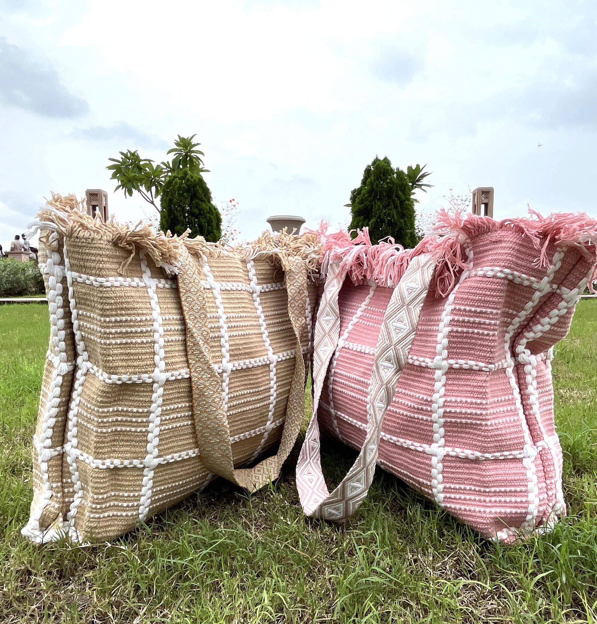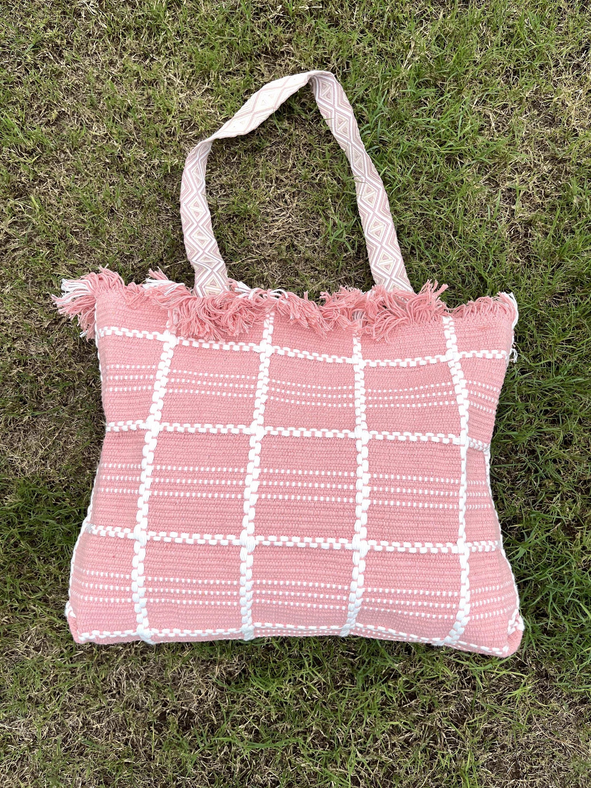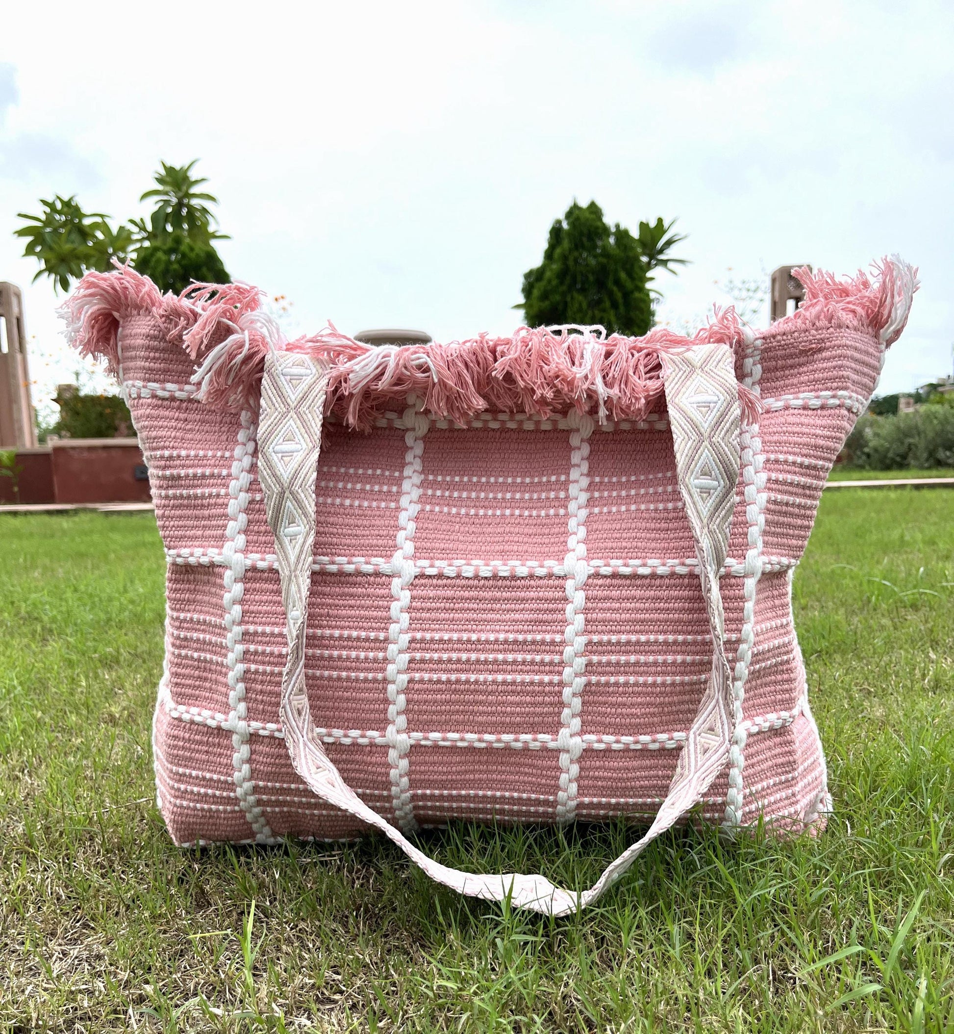 Fringe-Edge Canvas Thread Work Tote Bag with Single Partition| Pink | Beige | Broadbelt