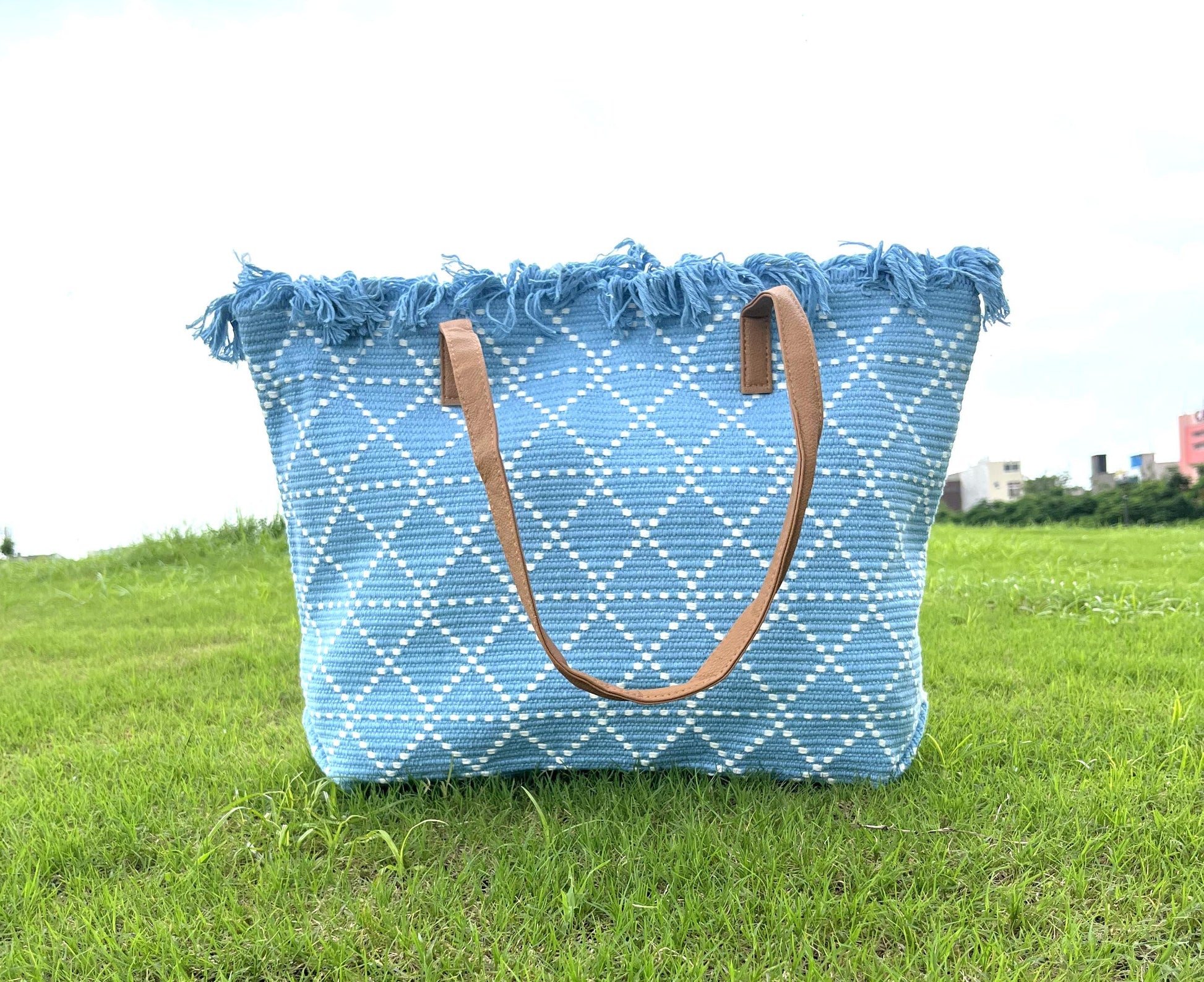 Hand-crafted Large Fringe-Edge Canvas Thread Work Tote Bag with Single Partition. It can be a perfect gift for your near and dear ones.
