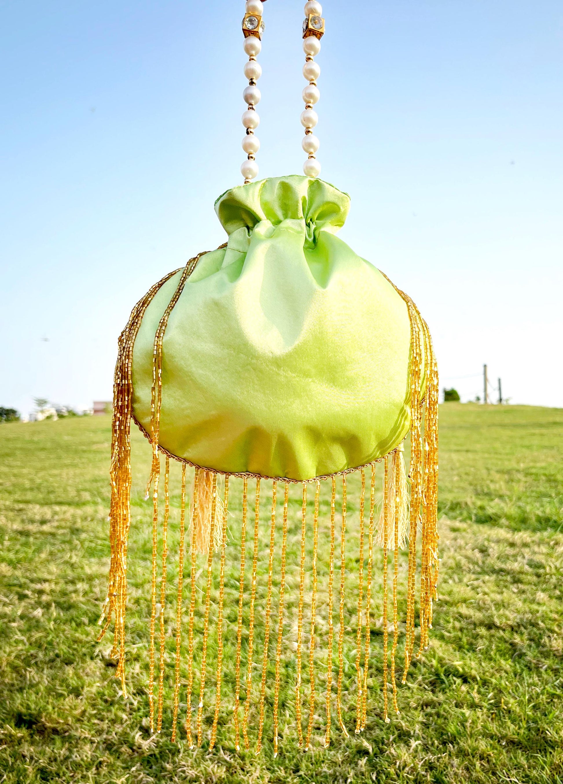 Hand-Embroidered Green Potli Bag with Pearl Handle | Green Zardosi Potli Bag | Beaded India | Bridsl potli pursen Wedding Favor Purse