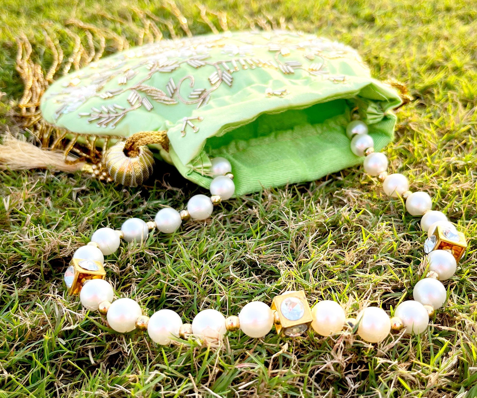 Mint Green Embroidered Pearl Potli Bag with Tassels – Handmade Bridal Potli