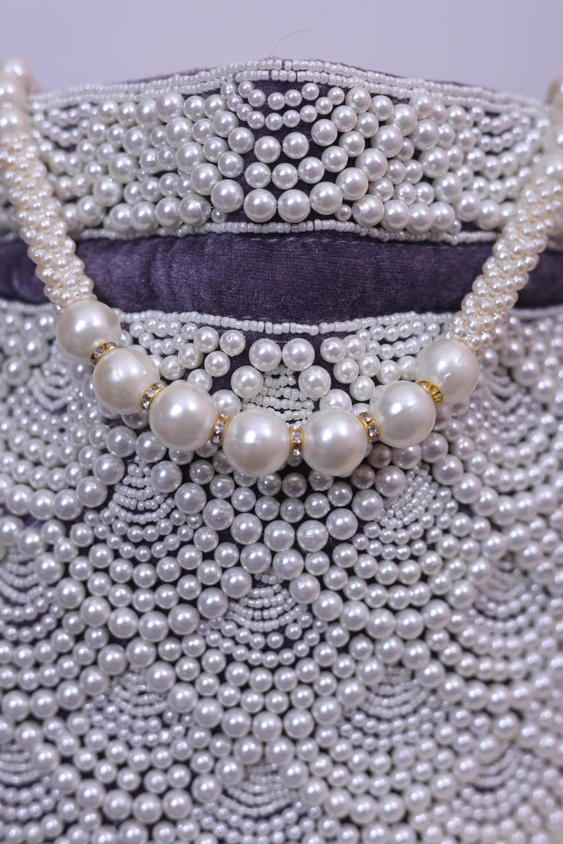 Add timeless elegance to your wedding or festive attire with this handcrafted grey pearl beaded potli bag. Meticulously adorned with shimmering faux pearls on a soft base, this drawstring pouch is perfect for Indian weddings, receptions, and ethnic events.
