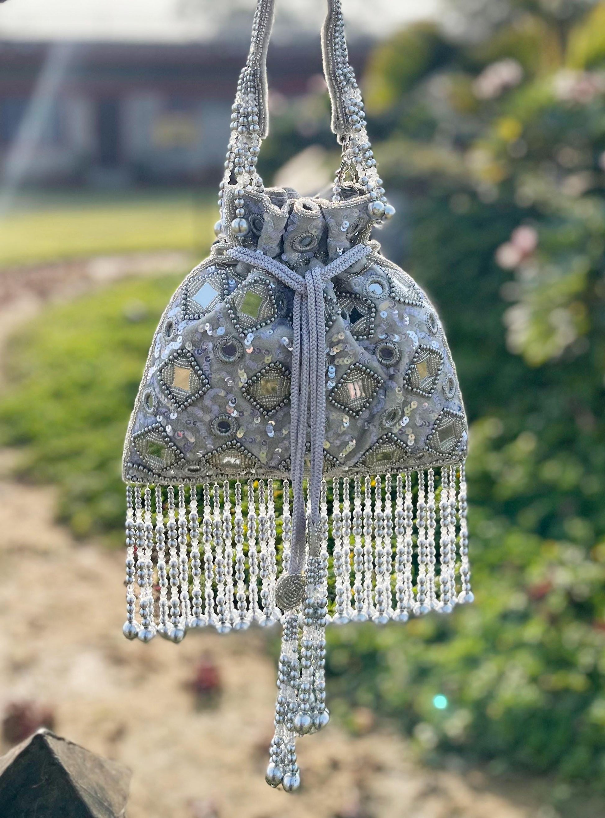 Handcrafted Gray Mirror Potli Bag: Bridal Wristlet Gift