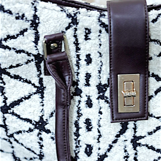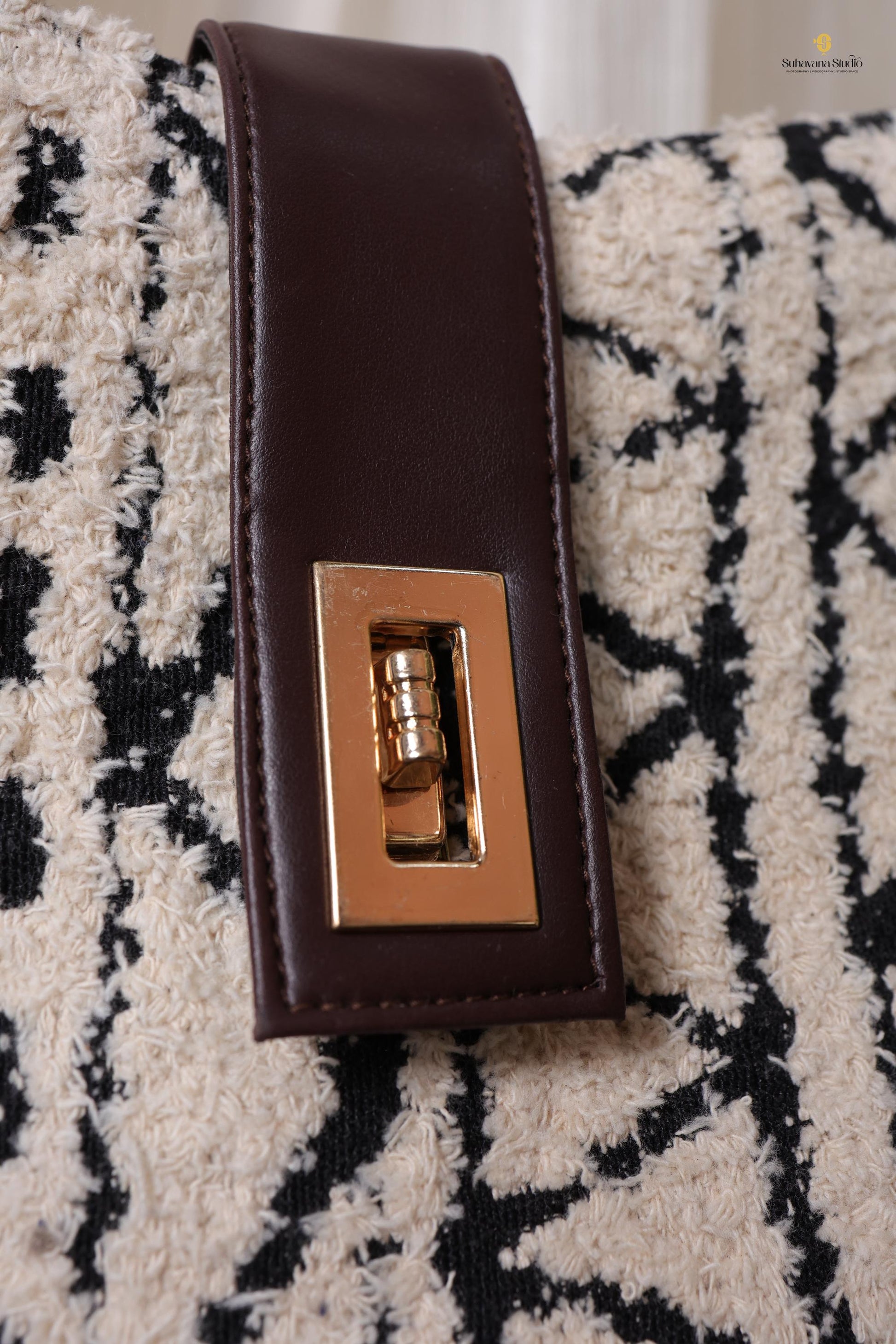 Black & Ivory Textured Tote Bag with Lock Closure | Handmade Geometric Fabric Shoulder Bag with Zipper Pouch
