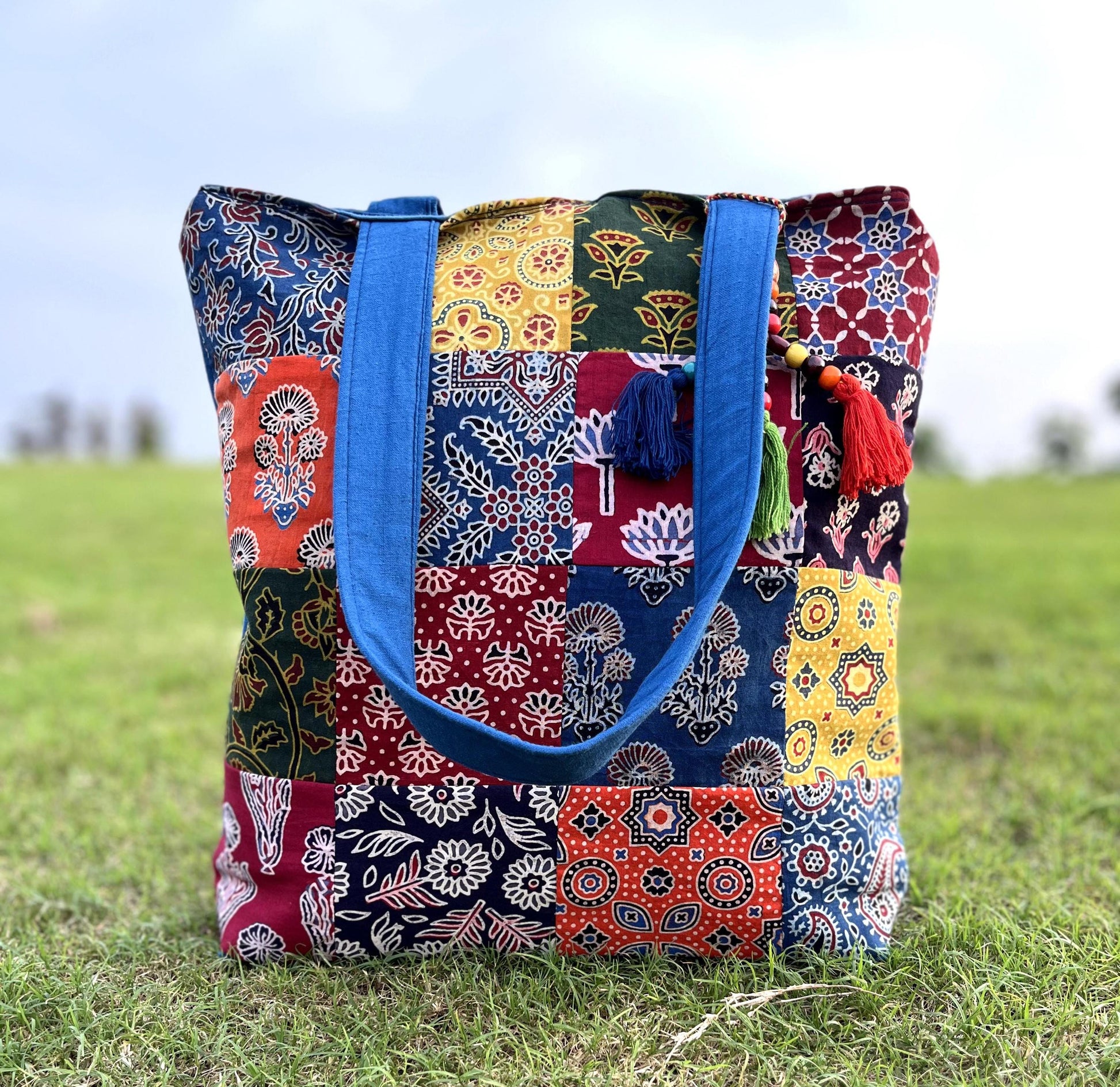 Handmade Ajrakh Print Tote Bag: Cotton Patchwork Shoulder Bag