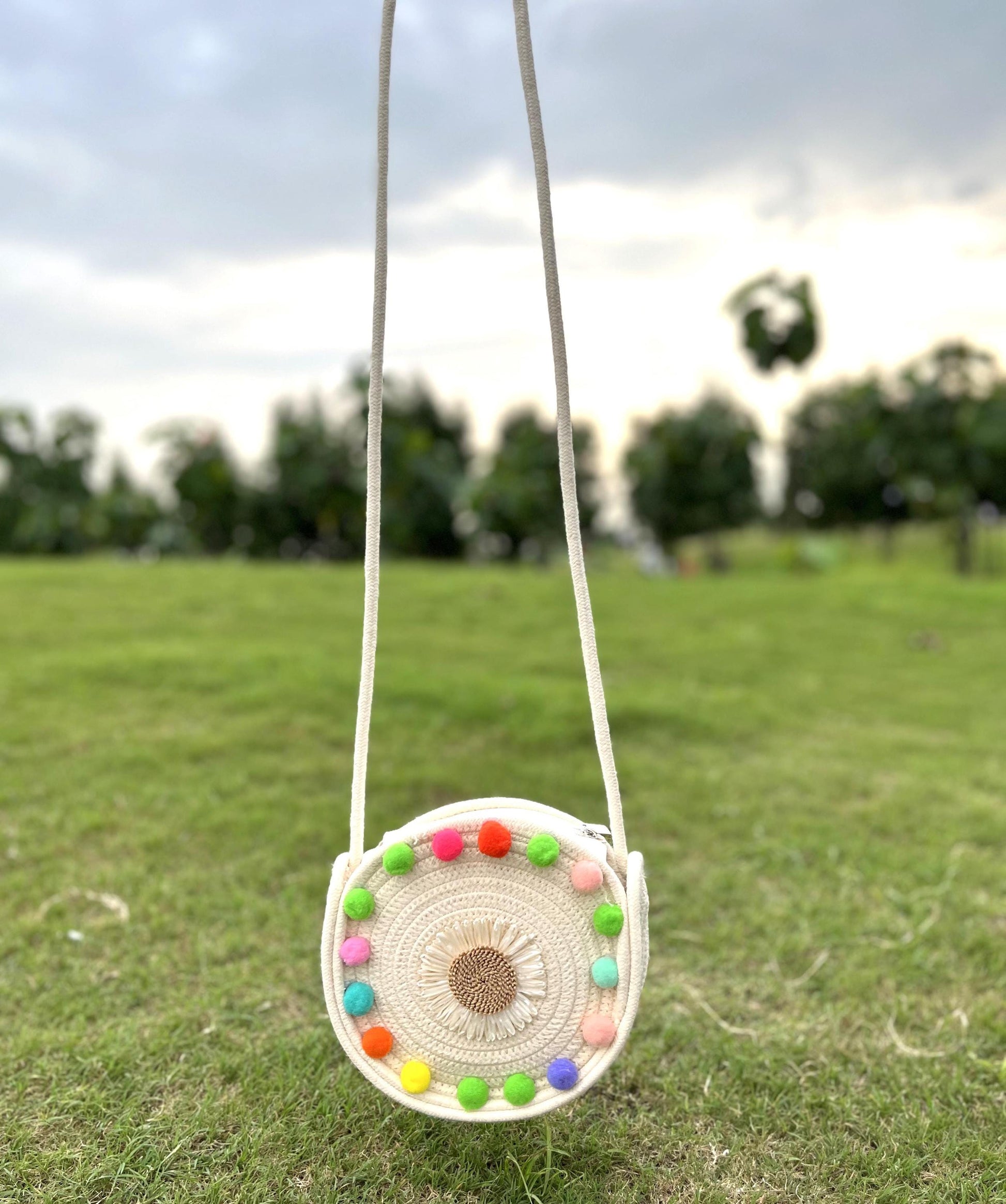 Stylish Sling Bag: A jute handbag in a round form with a pompom accent which makes it perfect for women and girls.