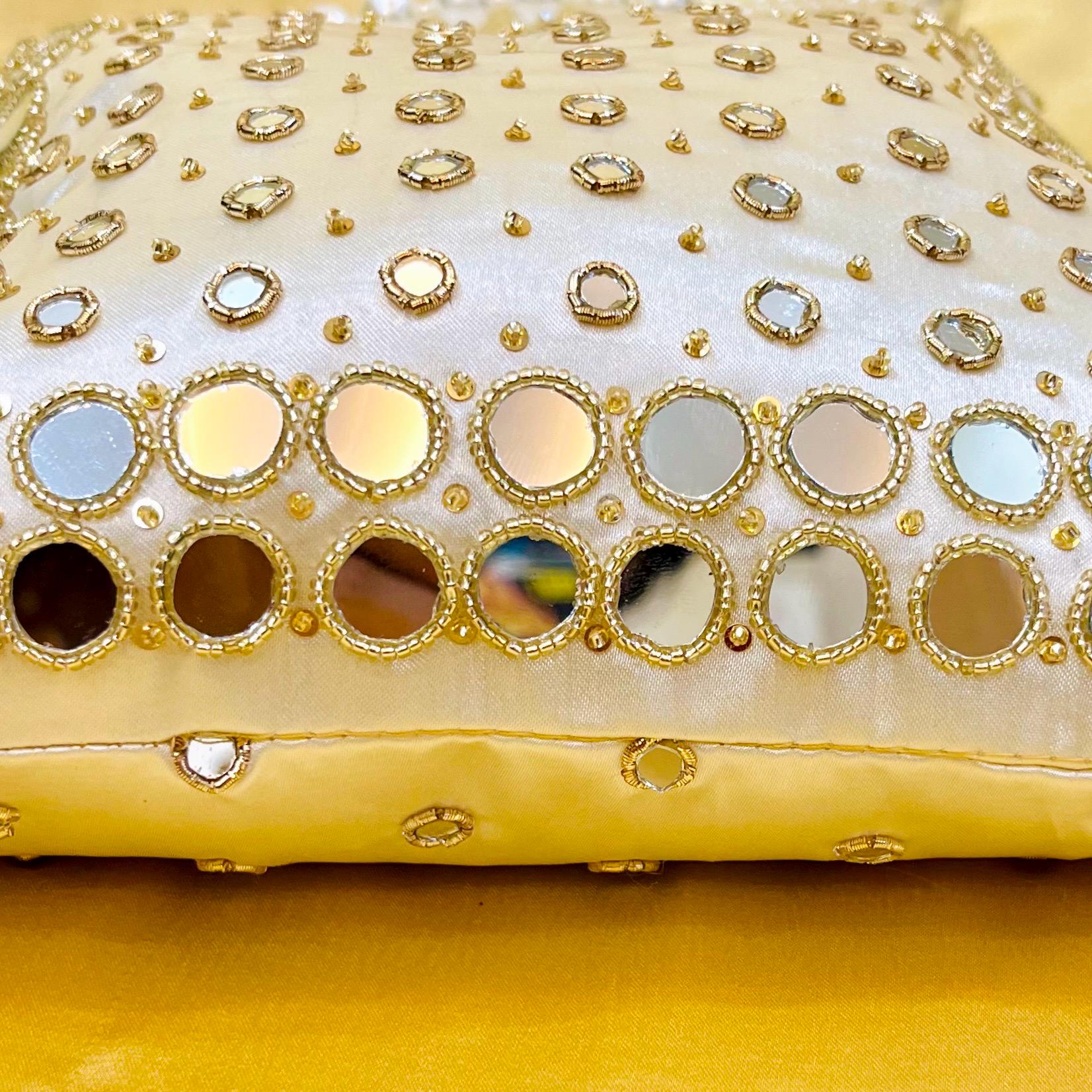 Add a touch of traditional and modern elegance to your outfit with this stunning Indian handmade ivory mirror work potli bag. Expertly crafted with intricate mirror work and delicate embroidery, this potli is perfect for weddings, festive occasions, or as a luxurious gift bag.