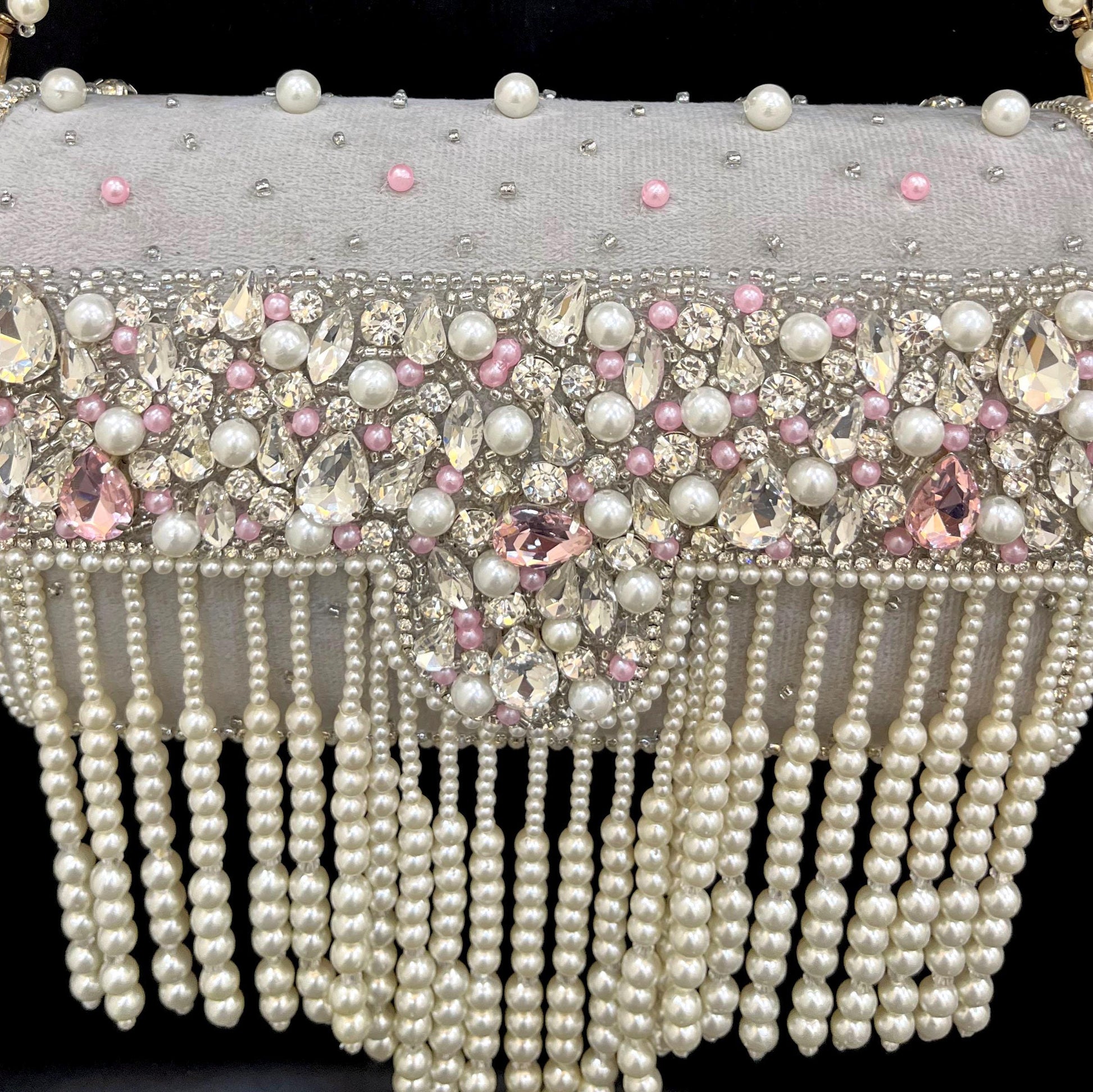Handmade Pearl & Crystal Beaded Clutch Bag | Grey & Ivory Bridal Purse with Fringe | Wedding Evening Handbag | Luxury Party Clutch