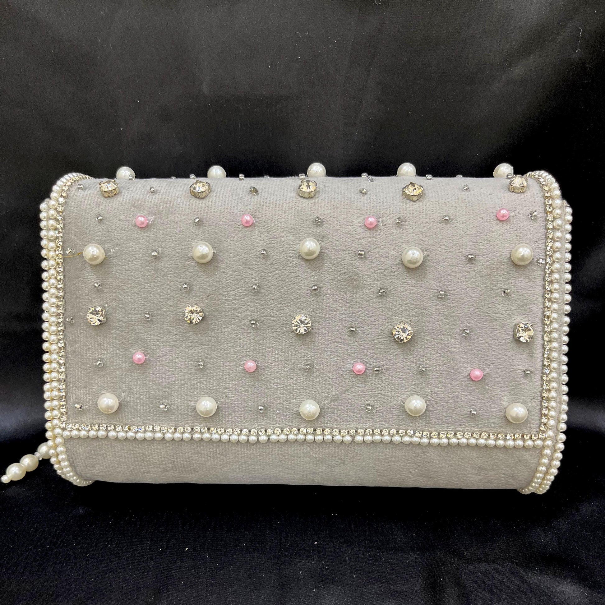 ✨ Step into elegance with this handmade pearl & crystal beaded clutch bag in grey and Ivory tones.