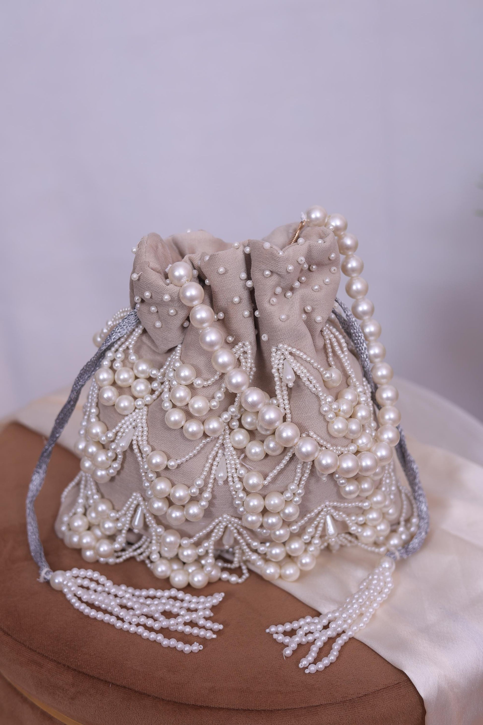 Luxury Pearl Beaded Potli Bag -Both Side| Handcrafted Beige Evening Clutch | Indian Wedding Purse | Bridal Party Bag | Handmade Gift for Her