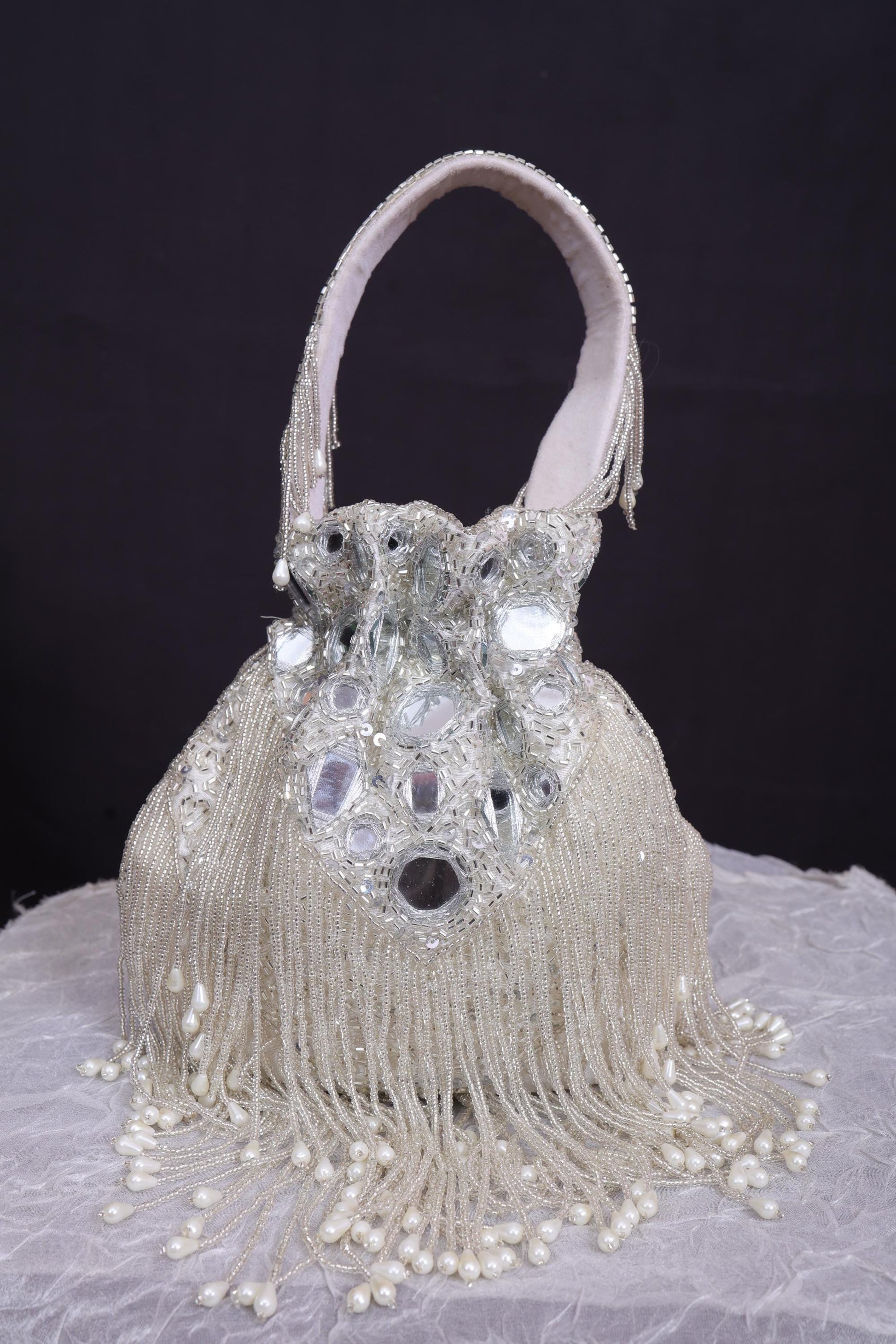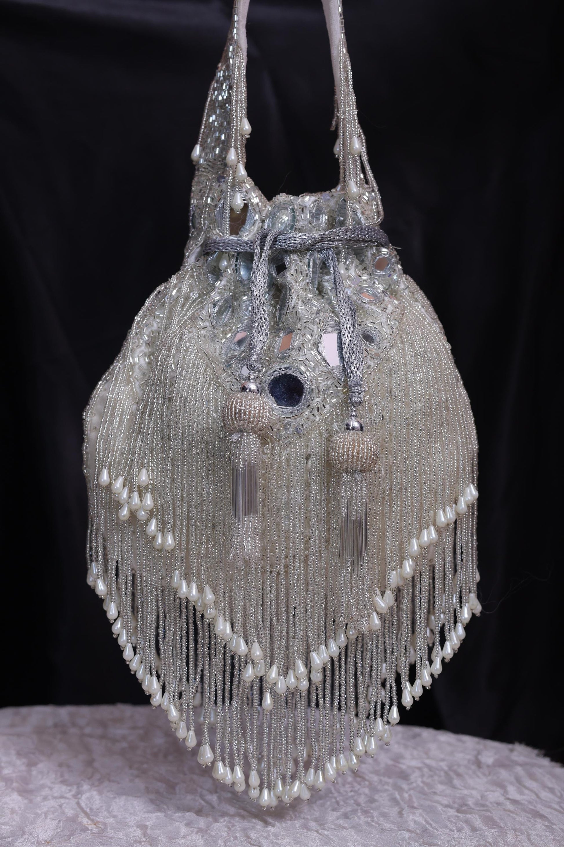 Luxury Silver Beaded Pearl White Potli Bag | Handmade Bridal Purse | Indian Evening Handbag for Weddings, Parties & Special Occasions