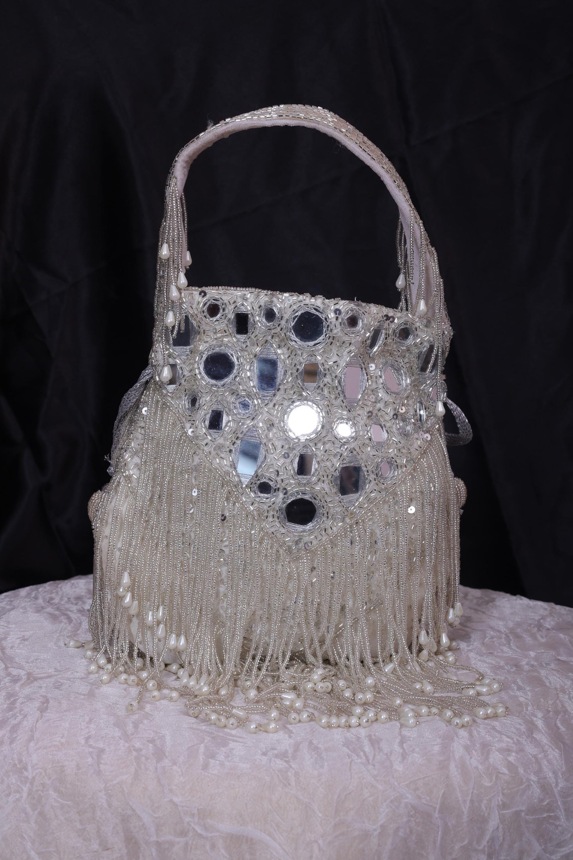 Elevate your look with this stunning handmade Silver beaded White clutch bag featuring luxurious pearl tassels and mirror embellishments. Perfect for weddings, evening parties, and festive occasions, this designer handbag adds a royal touch to any outfit. Each piece is handcrafted with intricate beadwork and fine detailing, making it a unique accessory for brides, bridesmaids, and fashion lovers alike. Ideal for USA and UK buyers looking for a glamorous statement purse.