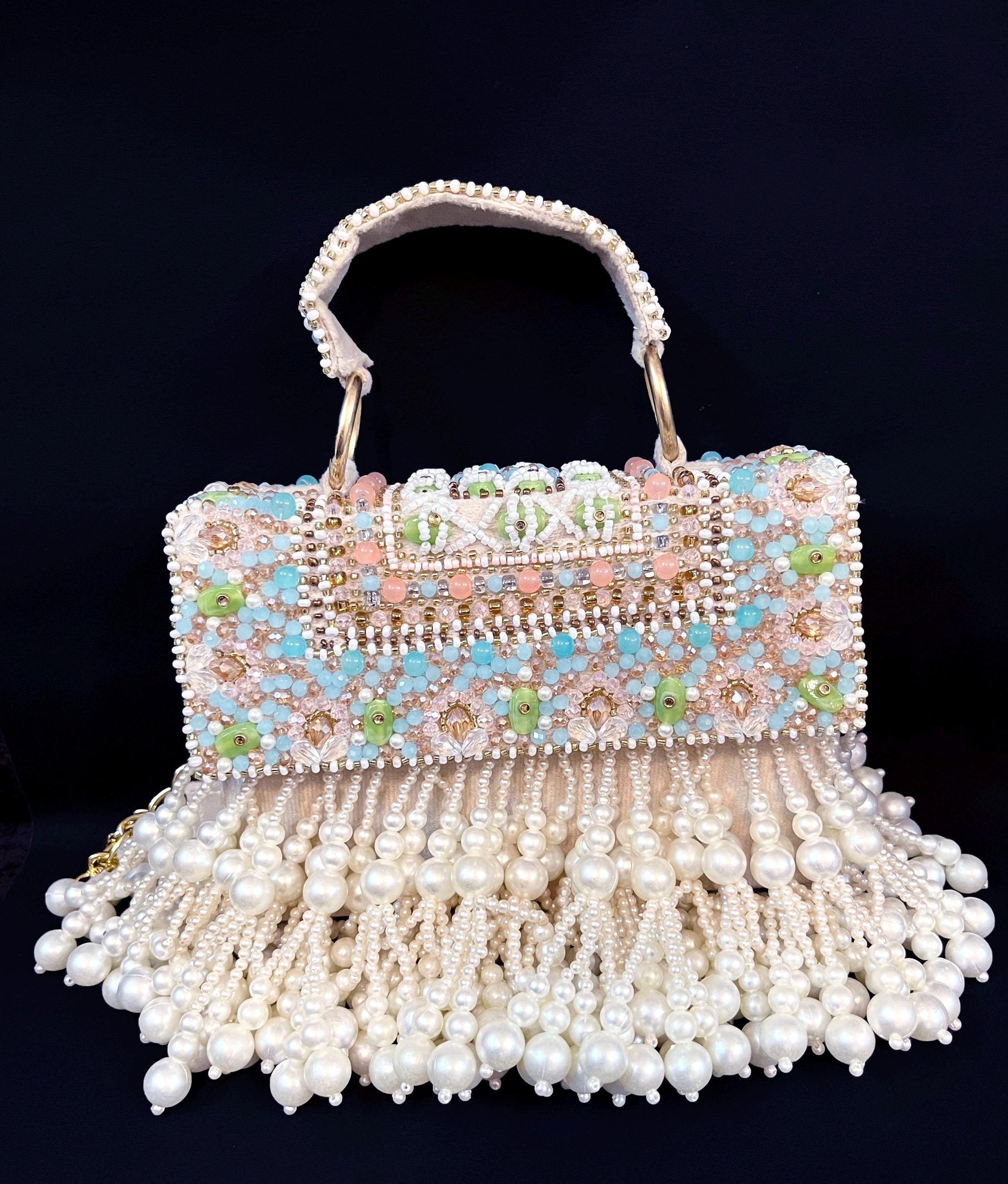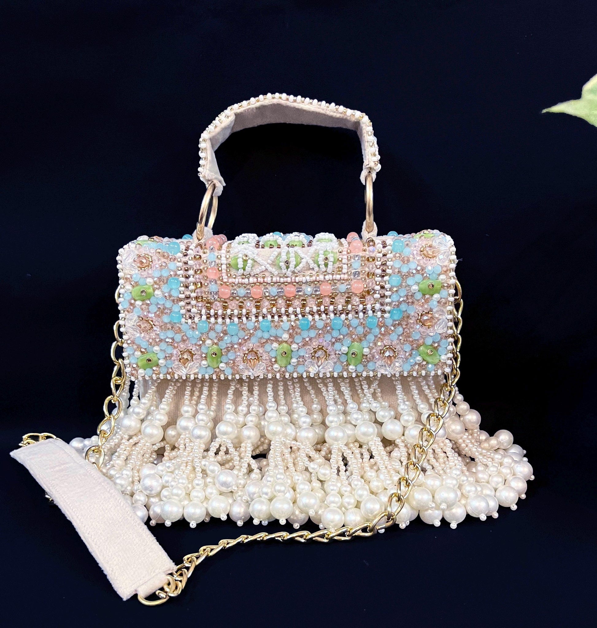 handmade beaded clutch, pearl fringe handbag, bridal party purse, wedding clutch with chain, designer evening bag, bridesmaid gift purse, luxury pearl handbag, multicolor beaded bag, festive clutch purse, handmade shoulder bag