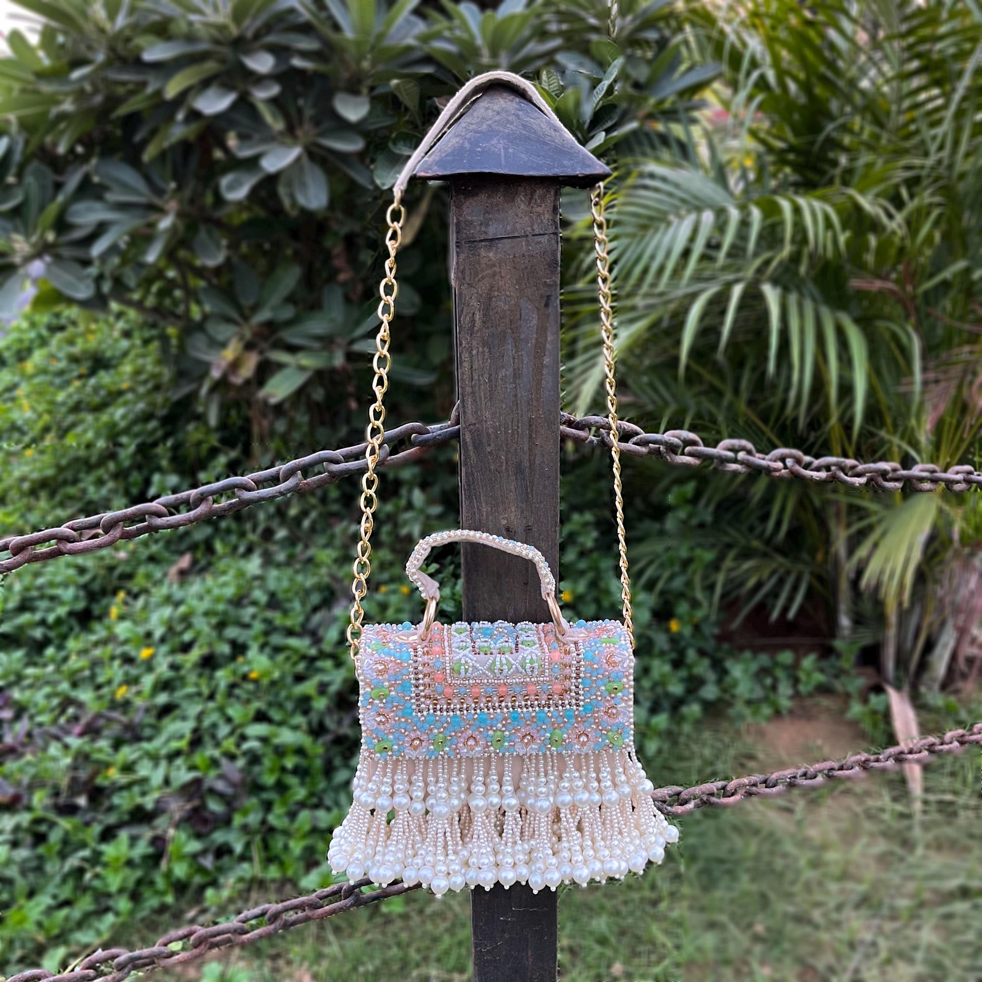 Expertly crafted with multicolor bead embroidery, pearl tassels, and a gold chain strap, this designer-inspired clutch is the ultimate accessory for weddings, parties, and special occasions.
