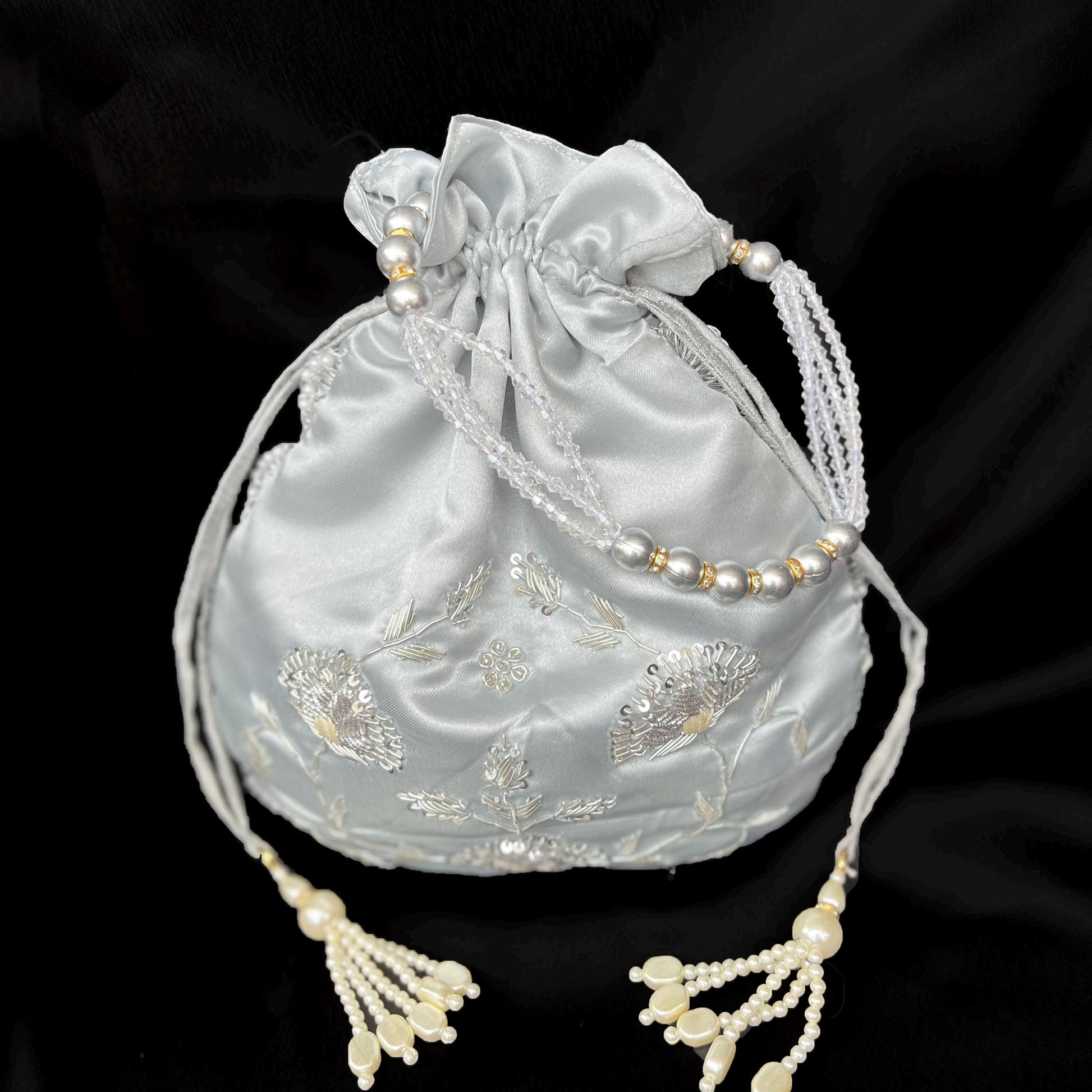 Make a statement with this stunning silver satin potli bag, beautifully handcrafted with intricate embroidery and beaded tassels. Perfect for weddings, bridesmaids, festive parties, or as a luxury gift pouch.
