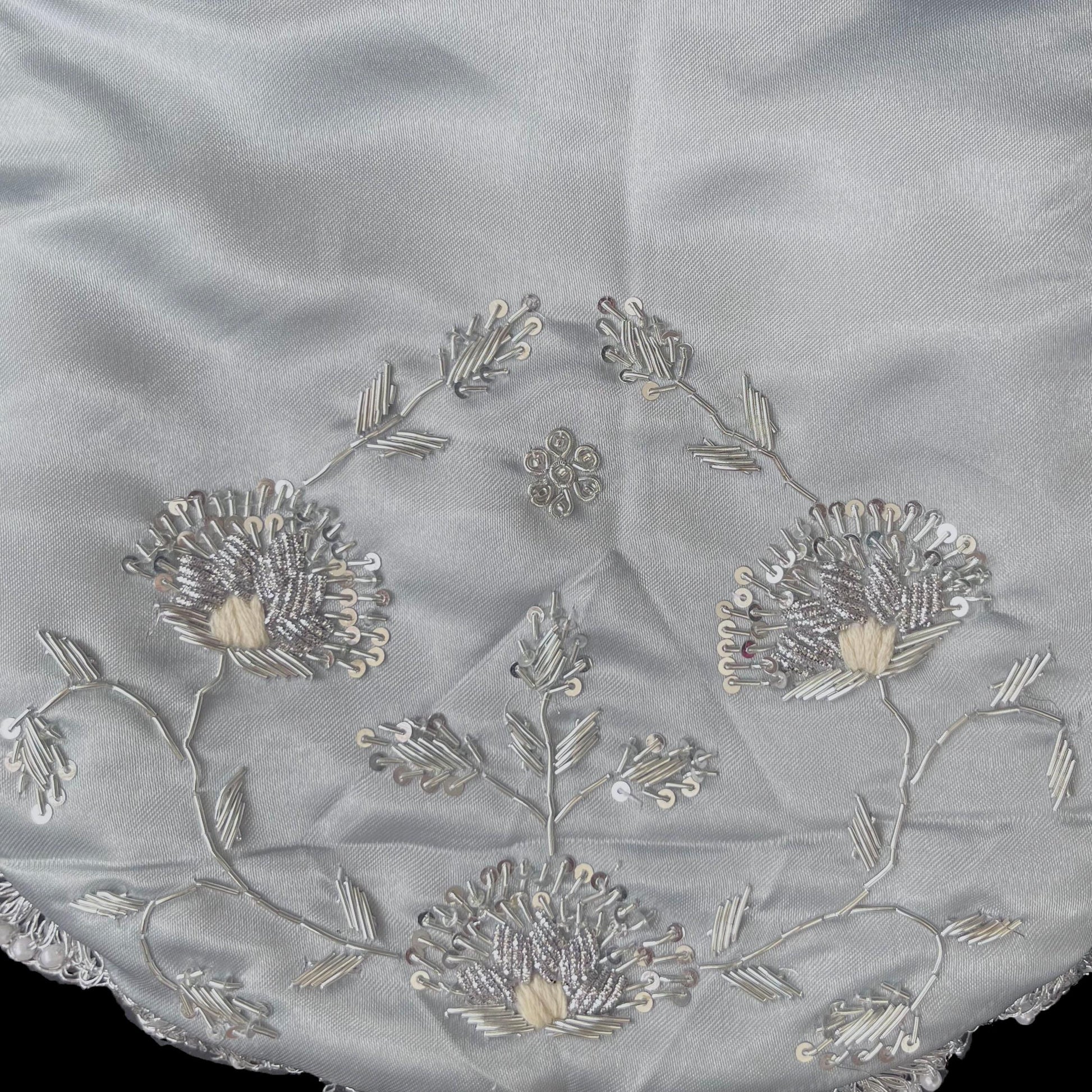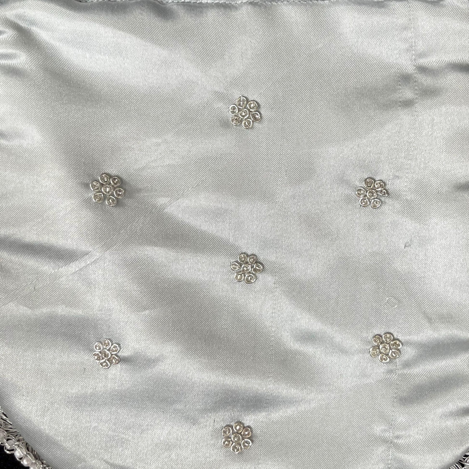 Elegant silver satin fabric with floral embroidery