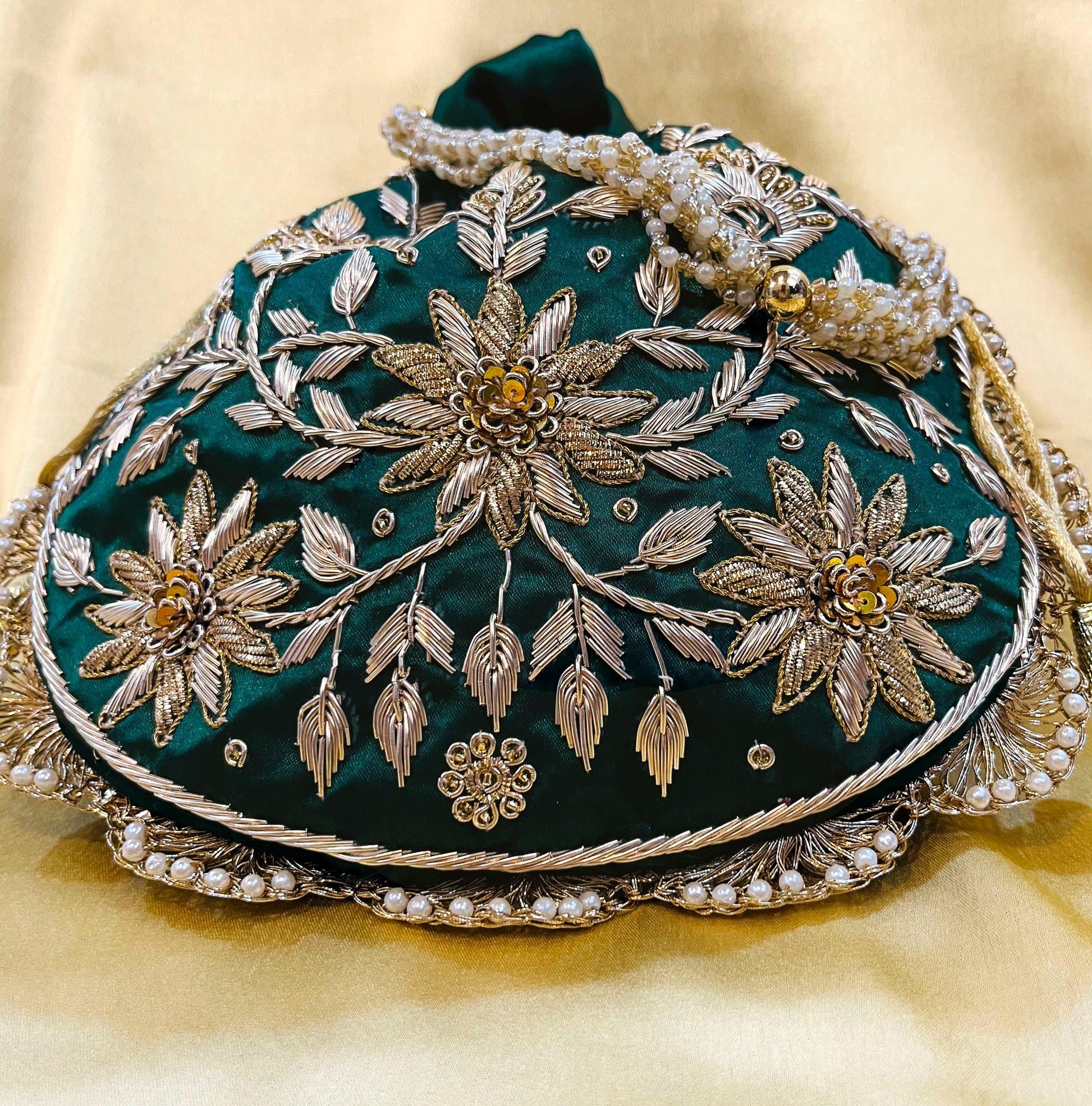 Grab our Stylish Indian Designer Zari Handwork Emerald Green Color Potli Bag with Drawstring pattern for all occasions