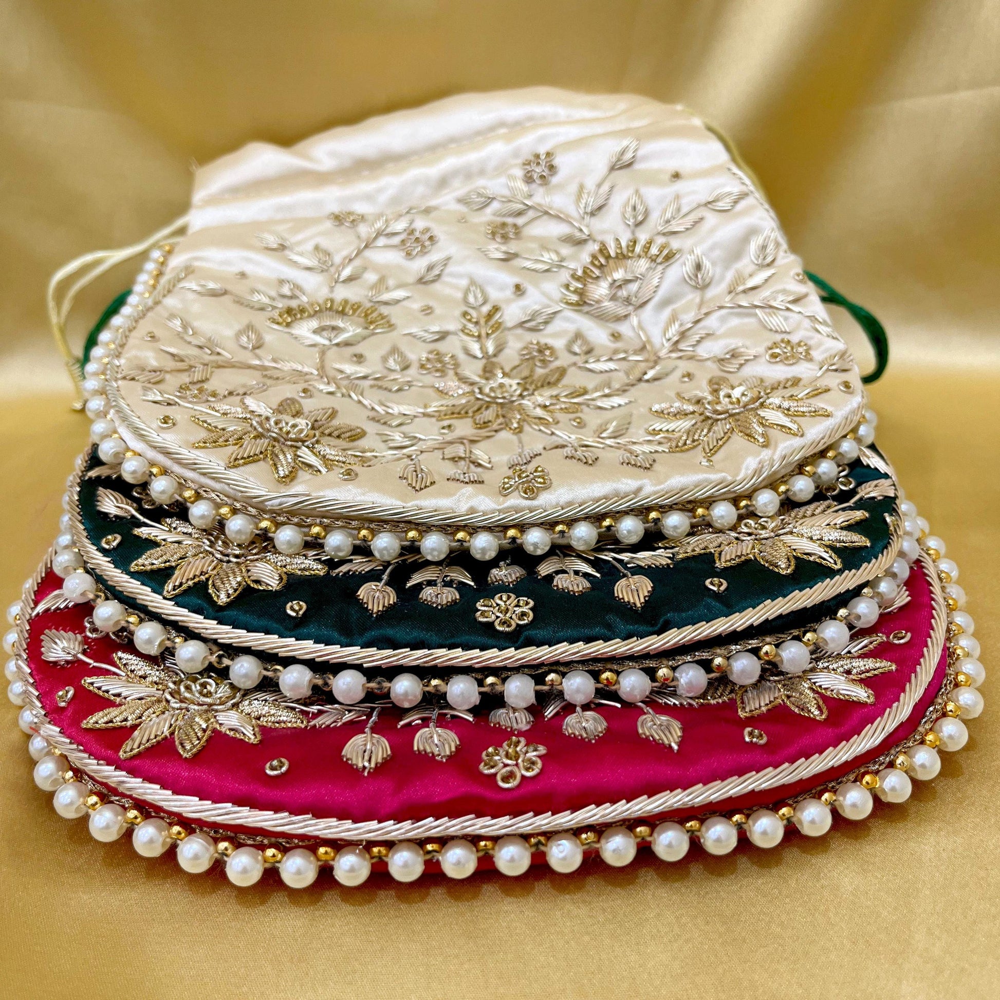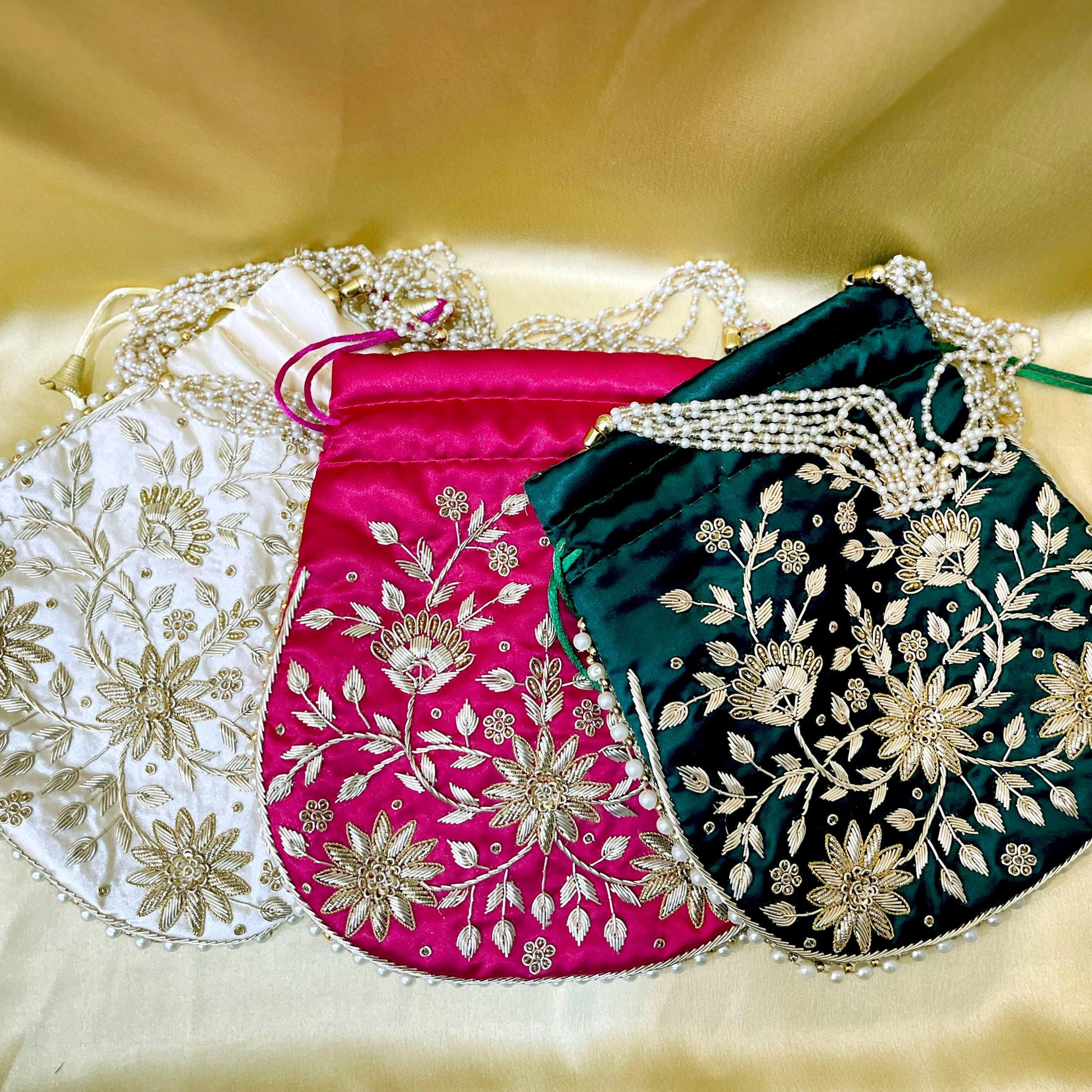 Zari Handwork Potli Bag: Emerald Green, Pink & Gold Indian Design